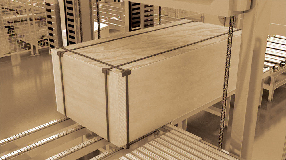As mercadorias são colocadas na linha transportadora, e os transportadores transportam as paletes para a posição de fixação.Ele adiciona bloco na parte inferior dos paletes e agrupando o primeiro cinto automaticamente, os paletes movem-se a uma curta distância e a máquina adiciona o segundo bloco e a correia PET, Repita o trabalho novamente pela terceira vez adicionando o bloco e a correia.
